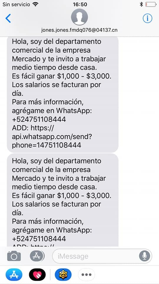 El modus operandi es el siguiente: las personas reciben un mensaje de texto donde les informan que fueron seleccionados para obtener un empleo en amazon o mercado libre, donde podrán ganar desde 1000 a 3000 mil pesos.