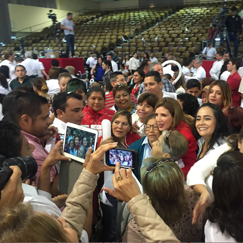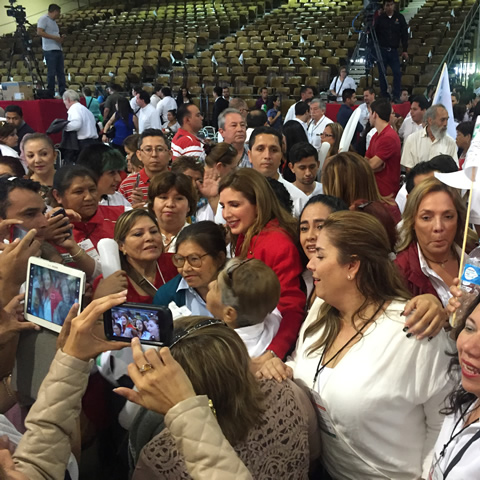 En un ambiente de completa fiesta en donde los priistas encumbraron a Almaraz como su candidato, importantes personalidades del sexenio de Eugenio Hernández estuvieron presentes en la fila principal, entre ellas su madre Susana Flores de Hernández, sus hermanas y su cuñado Oscar Gómez.