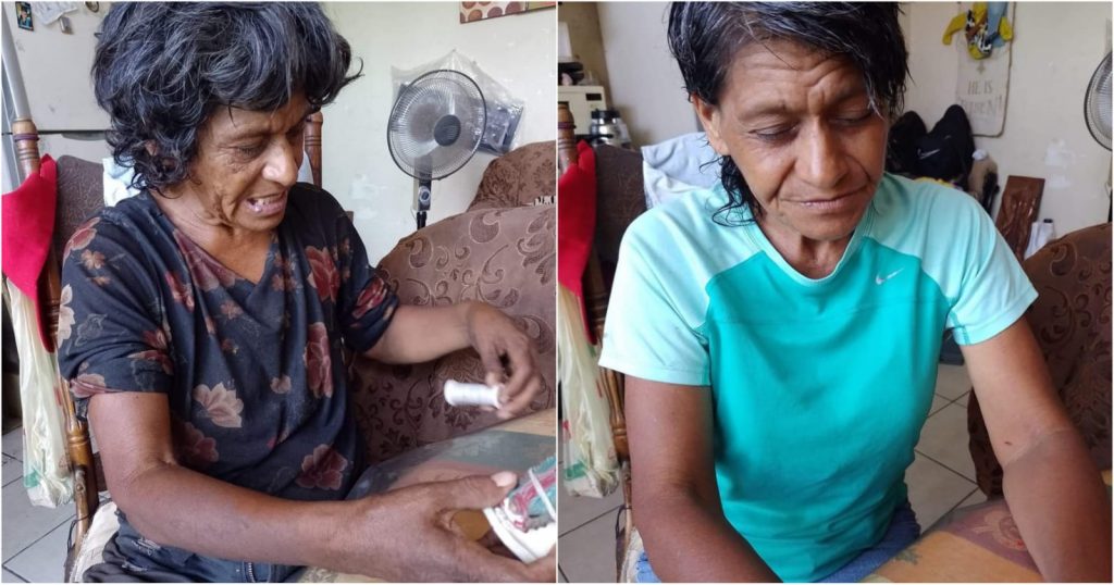 La señora Claudia decidió invitarla a bañarse en su hogar, regalarle ropa y alimentarla, y por ahora le da alojamiento, aparentemente la mujer lleva tiempo viviendo en situación de calle y padece de sus facultades mentales.