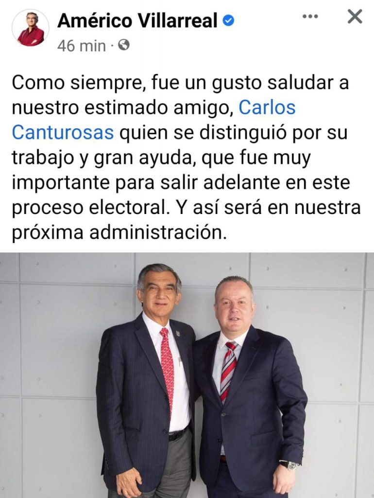 Américo Villarreal agradece el apoyo del hermano de Carmen Lilia Canturosas y se lee que será un funcionario de su gabinete.