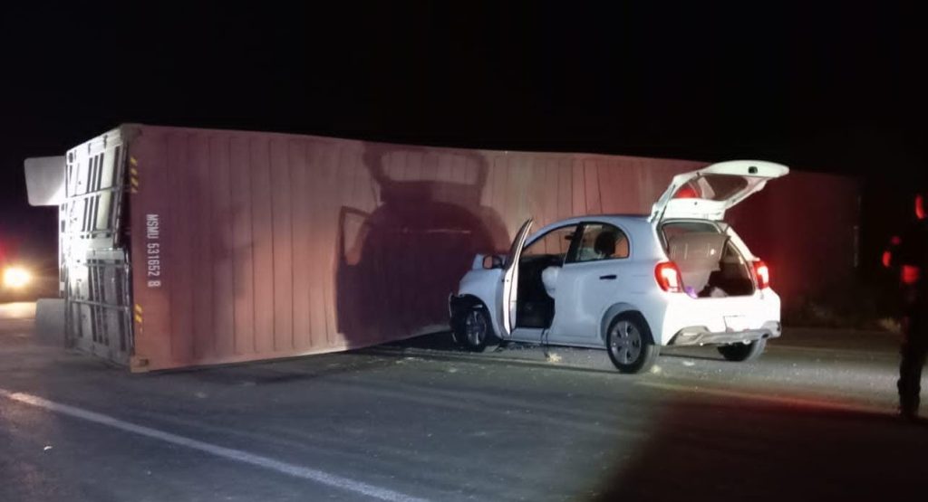 Tula, Tamaulipas.- Derivado del desprendimiento y volcadura de un contenedor, la circulación de sur a norte se encuentra cerrada en el kilómetro 12 de la carretera federal 101, del tramo Tula-San Luis Potosí.