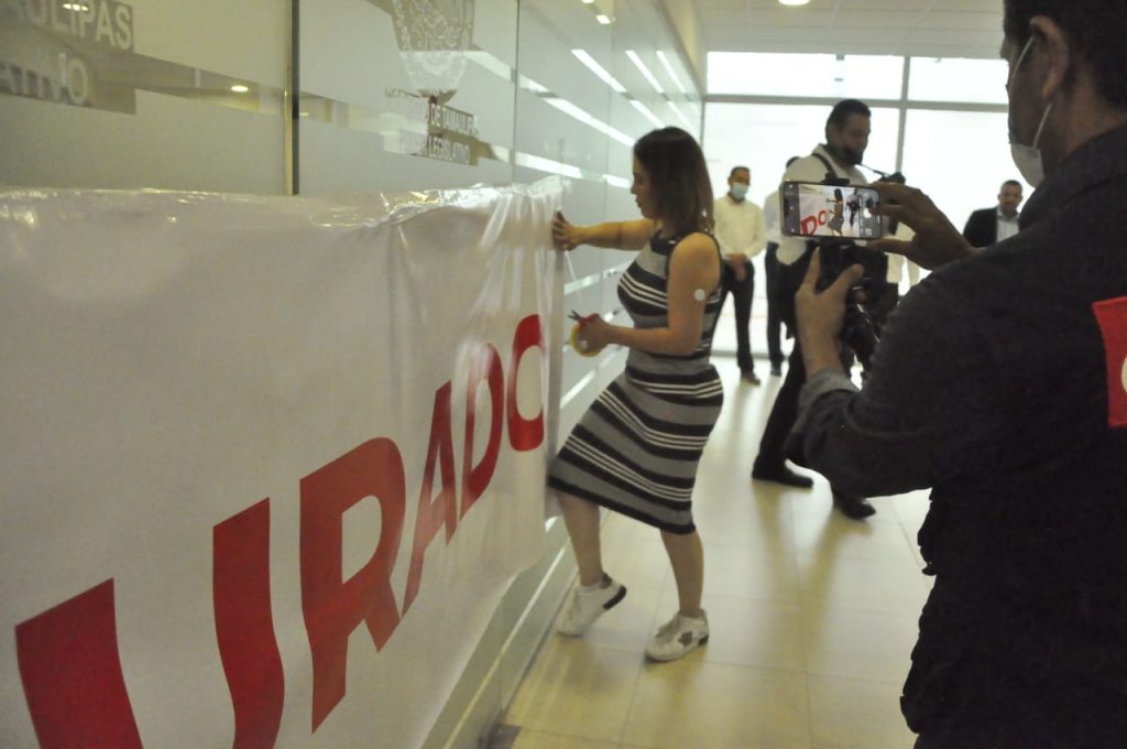 Con una manta que dice “Clausurado” en la puerta principal de la máxima tribuna parlamentaria del estado y detrás de ella una cadena con candado, el Grupo Parlamentario de Morena en el Congreso Local se “Amotinaron” en protesta por la imposición de leyes y reformas que pretenden “Blindar” el régimen político de estado que está por finalizar.