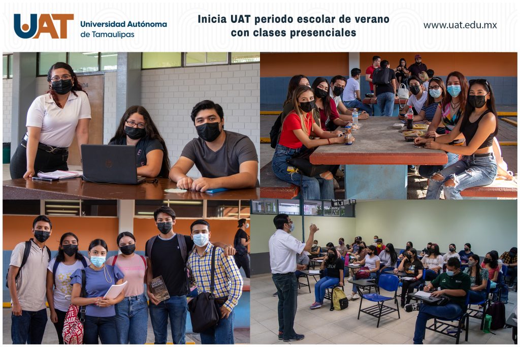 De acuerdo con el calendario escolar de la Universidad Autónoma de Tamaulipas (UAT), este 6 de junio estudiantes y docentes regresaron de manera presencial a las actividades académicas correspondientes al Período de Verano 2022 de la máxima casa de estudios en la entidad. Por primera vez desde la declaratoria por pandemia de COVID-19, las clases son impartidas de manera cien por ciento presencial en las diferentes facultades y unidades académicas en las sedes norte, centro y sur del estado. El período de clases de verano en la UAT, que se desarrollará del 6 de junio al 22 de julio del presente año, da a sus estudiantes la posibilidad de recuperar o adelantar materias de su plan de estudios. El C. P. Guillermo Mendoza Cavazos, Rector de la UAT, dio a conocer que los cursos se imparten de manera gratuita con la finalidad de brindar a todo el estudiantado esta oportunidad para seguir avanzando en su formación académica. El Rector ha puesto de relieve también que este período se constituye como el programa piloto de la Universidad para el regreso total a clases presenciales del próximo período escolar agosto-diciembre de 2022. Cabe señalar que todos los planteles universitarios están preparados para recibir de manera presencial a la comunidad estudiantil, cuidando en forma permanente los protocolos y medidas sanitarias, tanto dentro de las aulas como en espacios de recreación al aire libre. En este contexto, el Rector Guillermo Mendoza Cavazos ha hecho hincapié en los esfuerzos que se están haciendo para el retorno a las clases presenciales, apoyando la convivencia y el desarrollo integral de sus estudiantes con el fin de dar continuidad al regreso gradual a la totalidad de las actividades académicas.