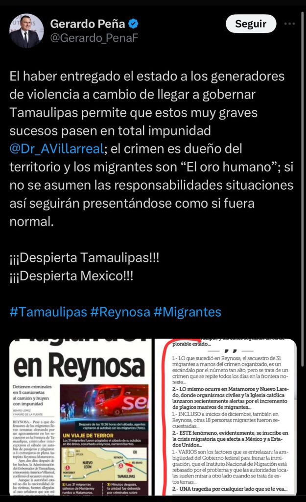 A través de sus redes sociales envió un mensaje donde expuso “ El haber entregado el estado a los generadores de violencia a cambio de llegar a gobernar a Tamaulipas, permite que estos muy graves sucesos pasen con total impunidad; el crimen es el dueño del territorio y los migrantes son el otro humano”.
