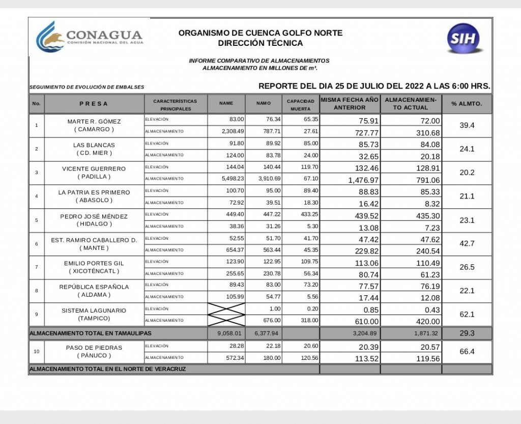 La Presa República Española, ubicada en Aldama, se encuentra a 22.1 por ciento de su capacidad y el Sistema Lagunario de Tampico a 62.1 por ciento de su almacenamiento.