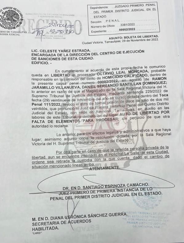 El Juez Primero de Primera Instancia, Santiago Espinoza Camacho manifestó en un oficio: “Sírvase dejar inmediata libertad al procesado del fuero común de nombre Octavio Leal Moncada dentro de la causa penal número 00002/2022 que se le instruyó ante el juez primero de primera instancia por el delito de homicidio calificado lo anterior en razón de qué el magistrado de la Sala Regional de Victoria mediante sentencia 229/2022 de fecha 29 de noviembre del año en curso se pronunció en auxilio del auto de Libertad por falta de elementos para procesar ordenando se deje de inmediato en libertad”.