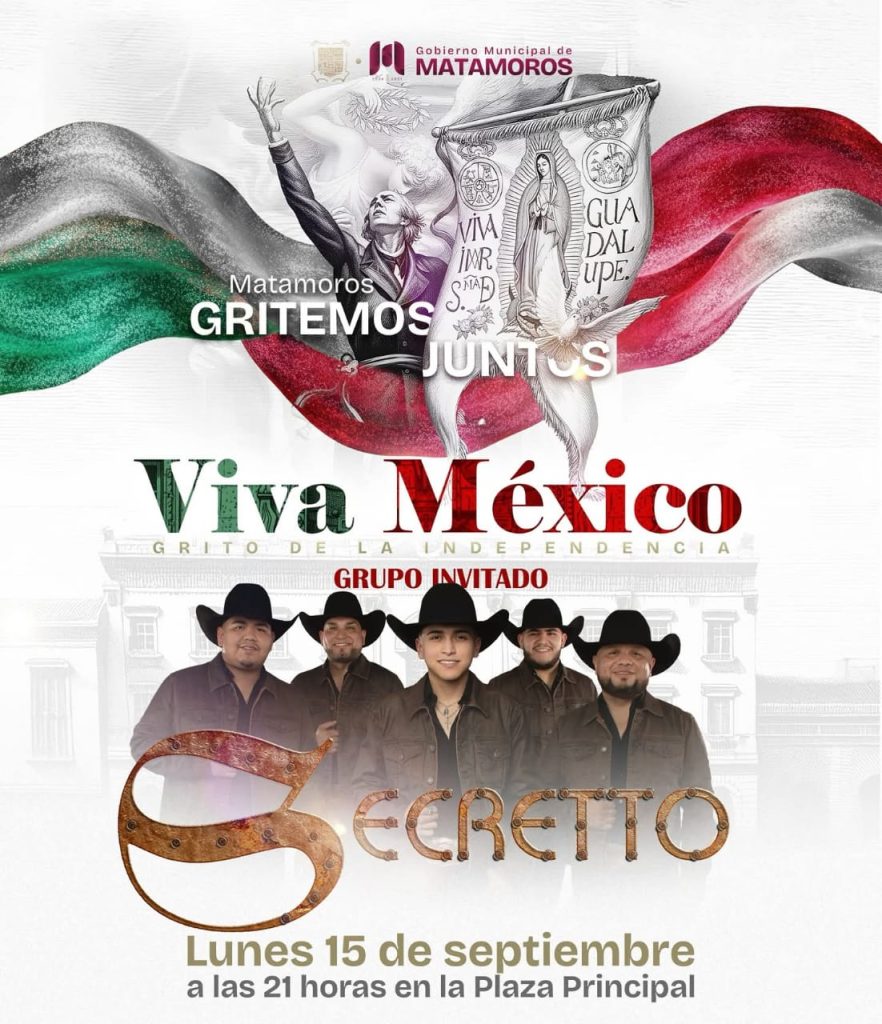 Presidente Municipal, Beto Granados, invita a todas las familias de Matamoros a celebrar juntos el tradicional Grito de Independencia, en la Plaza Miguel Hidalgo, el próximo 15 de septiembre; las actividades en la plaza comenzarán a partir de las 9:00 de la noche. Granados invita a vivir con orgullo esta gran fiesta mexicana e invita a disfrutar de música en vivo con la presentación especial del Grupo Secretto. Este evento es una oportunidad para reunirnos como comunidad, recordar nuestras raíces y rendir homenaje a los héroes que nos dieron patria y libertad, y para ello, el Gobierno Municipal ha preparado una celebración llena de color, música y tradiciones para que todas las familias disfruten en un ambiente seguro y familiar. Además del Grito de Independencia y la presentación de Grupo Secretto, se contará con antojitos mexicanos, actividades culturales y muchas sorpresas más. “No te lo puedes perder. Ven con tu familia y celebremos juntos el orgullo de ser mexicanos”, concluyó el alcalde, Beto Granados.