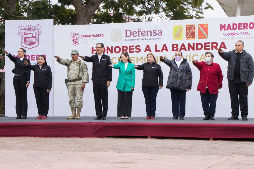 Como se ha venido realizando cada lunes, el presidente municipal Erasmo González Robledo presidió la ceremonia cívica de honores a la bandera, evento que tuvo lugar en la explanada de Palacio Municipal, con la participación de autoridades de la Secretaría de la Defensa Nacional y educativas, con el propósito de fortalecer los valores cívicos y fomentar el orgullo y amor por los símbolos patrios entre niños y jóvenes maderenses.