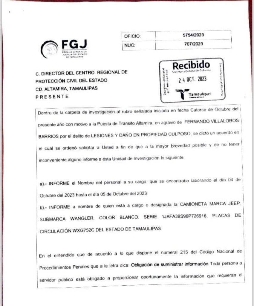 El masculino lesionado, de nombre Fernando Villalobos, estuvo en terapia intensiva en el hospital regional de Pemex a donde fue trasladado de emergencia para una mejor atención médica, ya que traía múltiples fracturas en su cuerpo, luego de ser solicitado por los familiares, tras encontrarse internado en el Hospital Canseco de Tampico, mientras que la unidad Jeep Wrangler color blanco se encuentra resguardada en el mesón municipal, según consta en la carpeta de investigación bajo el oficio 5757/2023 fechado a 23 de octubre del 2023, donde se informa y solicita a la Dirección de Protección Civil Regional, la colaboración de la Dependencia.