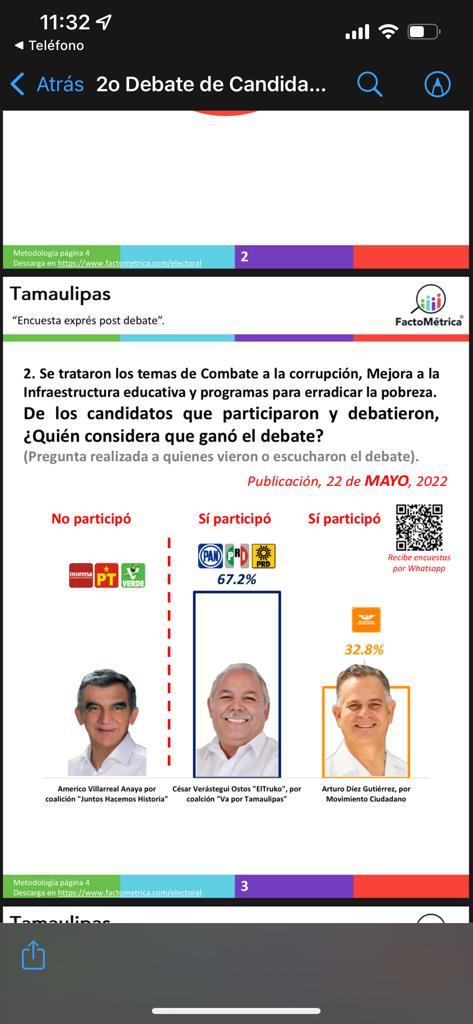 De acuerdo a FactoMétrica, el abanderado de la Coalición “Va por Tamaulipas” obtuvo el 67.2 por ciento de la aprobación, contra un 32.8 del otro participante, el candidato de Movimiento Ciudadano, Arturo Diez Gutiérrez.