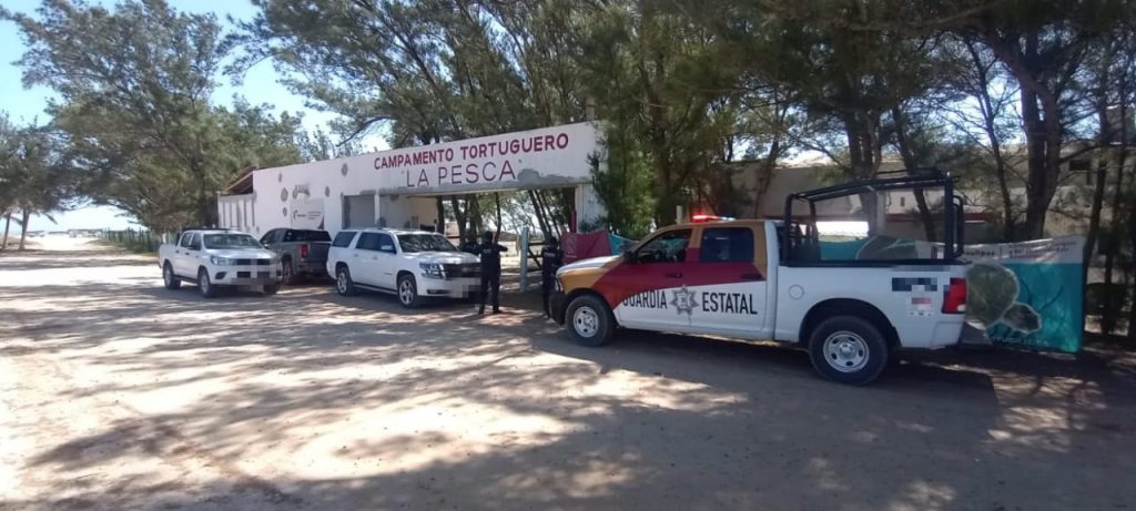 Soto la Marina, Tamaulipas.- Como parte de las labores para la conservación de la tortuga lora, personal de la Guardia Estatal lleva a cabo recorridos de seguridad y vigilancia en el campamento tortuguero del poblado La Pesca en el municipio de Soto la Marina.