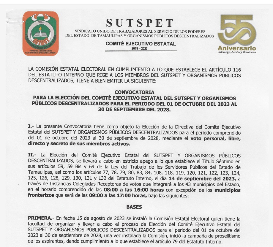 Ciudad Victoria, Tamaulipas.- El día de hoy sale la convocatoria para los afiliados al Sindicato Único de Trabajadores al Servicio de los Poderes del Estado de Tamaulipas (Sutspet), eligan este el 14 de septiembre el titular de la Secretaría General, de acuerdo a las bases que establece la convocatoria.