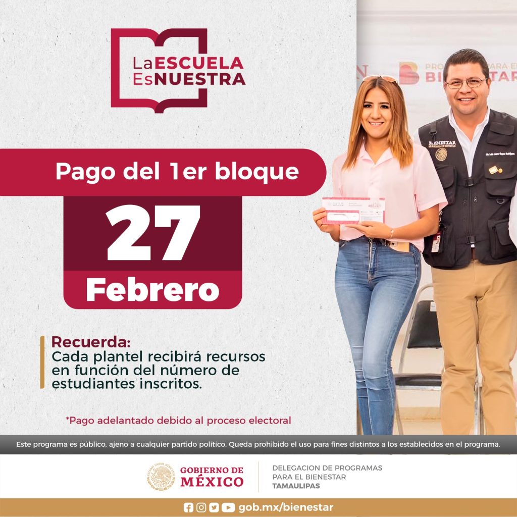 Ciudad Victoria, Tamaulipas.- El Delegado Federal Prof. Luis Lauro Reyes Rodríguez dio a conocer qué el pago del Programa “La Escuela es Nuestra”, iniciará a partir de hoy 27 de Febrero, a mil 914 planteles, que estarán recibiendo 736 millones 900 mil pesos de inversión a la educación en Tamaulipas.