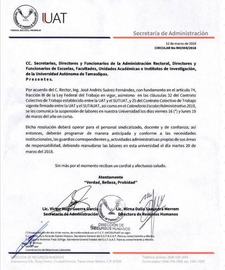 12 MAR La UAT tendrá mega Puente Ciudad Victoria Tam. El rector de la universidad Autónoma de Tamaulipas José Andrés Suárez Fernández autorizó lo que es llamando un mega “Puente” que serán viernes 16 de marzo y lunes 19 del mismos mes. Post Author: Editor 1