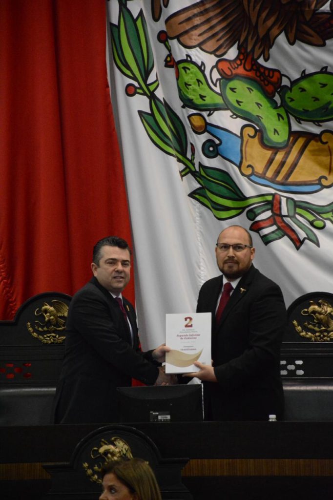 Al dar cumplimiento a lo dispuesto en la Constitución Política del Estado de Tamaulipas, ante el pleno legislativo, Villegas González entregó al diputado Eliphaleth Gómez Lozano, presidente de la Mesa Directiva del Congreso, el documento que contiene el estado que guarda la administración pública de Tamaulipas, cuya glosa se realizará en los próximos días.