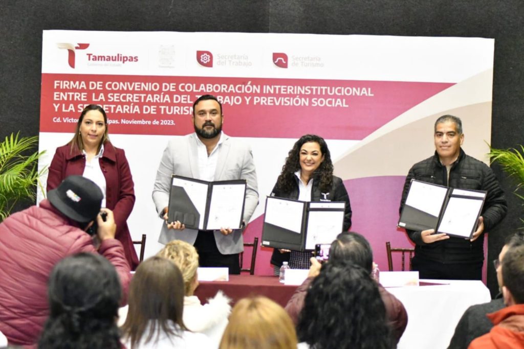 Ciudad Victoria, Tamaulipas. – La Secretaría del Trabajo y Previsión Social en coordinación con la Secretaría de Turismo del Gobierno de Américo Villarreal Anaya, firmaron un convenio de colaboración para trabajar de manera conjunta, en la certificación de prestadores de servicios turísticos con el propósito de fortalecer la atención a la ciudadanía, así como incrementar la productividad de los operadores en este rubro en el estado.