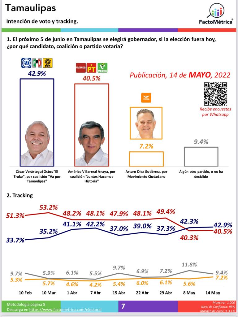 Un sonde demoscópico realizado por la casa encuestadora FactoMétrica lo apuntala con un 42.9 por ciento de las preferencias electorales de los tamaulipecos, seguido del candidato de Morena con un 40.5, los indecisos representan un 9.4 por ciento mientras que en último lugar aparece el representante de Movimiento Ciudadano con el 7.2 por ciento.
