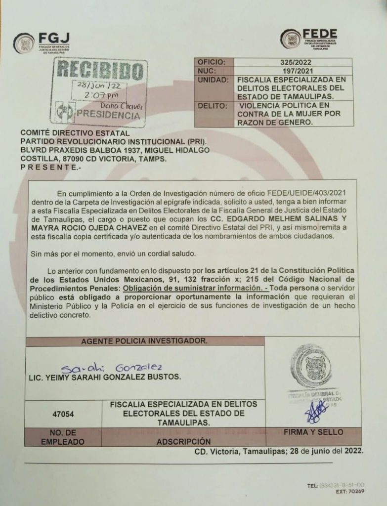 El oficio fue entregado a Edgar Melhem con fecha de 28 Junio en las oficinas del PRI por agentes adscritos a la Fiscalía Especializada en Delitos Electorales en Tamaulipas.